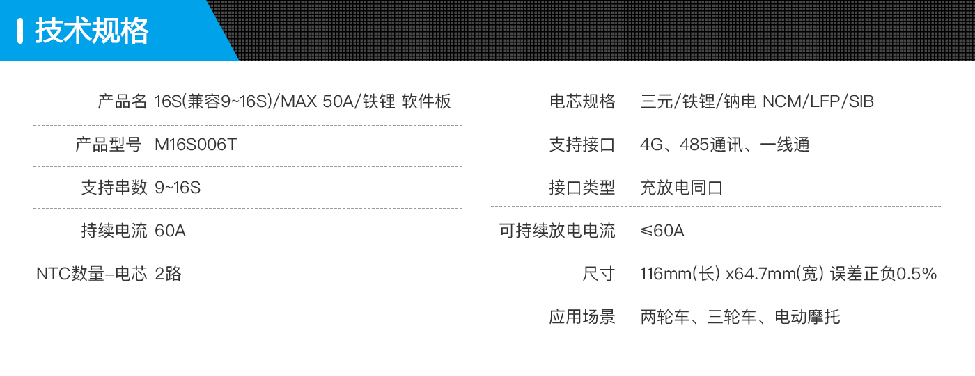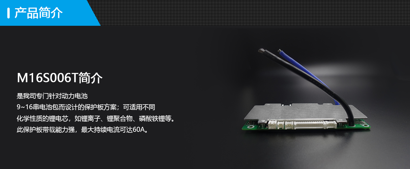 河馬M16S006T是我司專門針對動力電池 9~16串電池包而設計的保護板方案;可適用不同 化學性質的鋰電芯,如鋰離子、鋰聚合物、磷酸鐵鋰等。此保護板帶載能力強,最大持續(xù)電流可達50A。